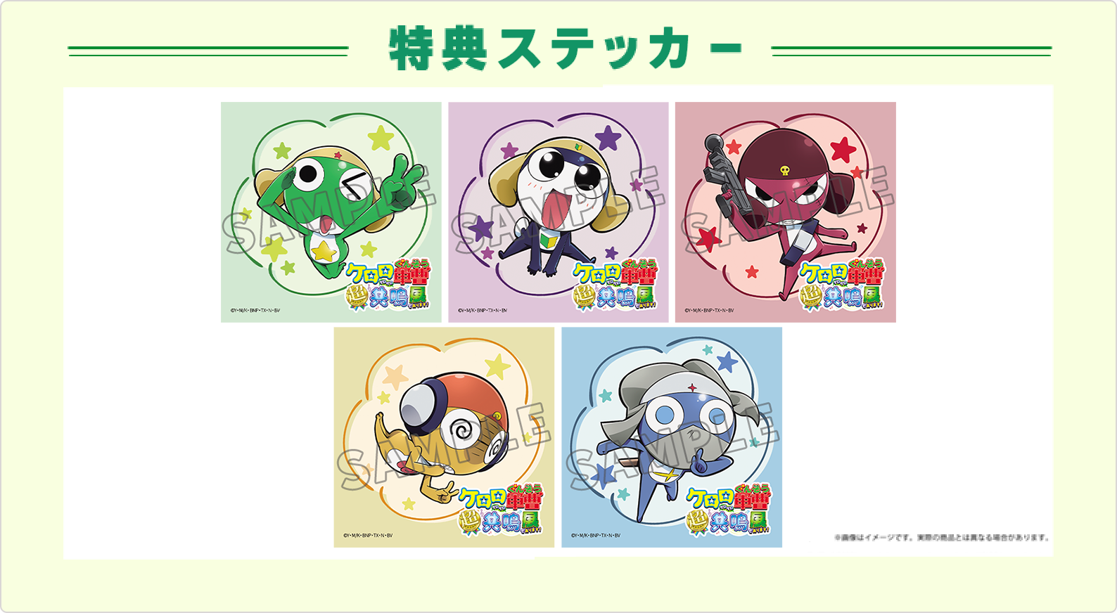 物販にてお1人様1会計あたり2,000円(税込)お買い上げ毎に、 展示会メインビジュアルを使用した特典ステッカー(全5種)をランダムで1枚プレゼントいたします。 サイズ:約50mm×50mm ※絵柄はお選びいただけません。